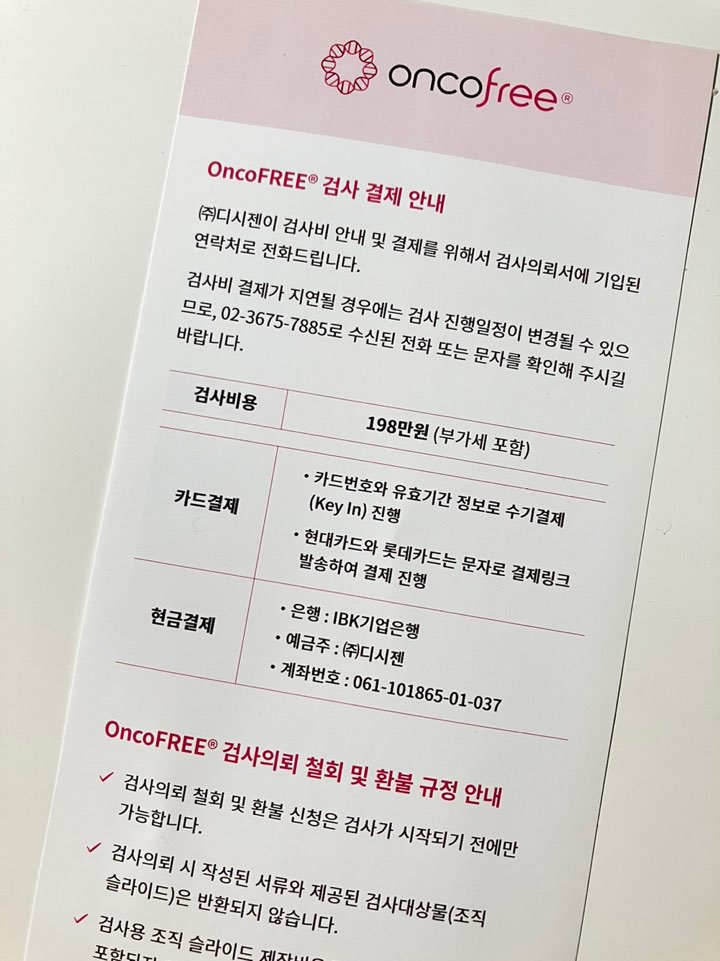 제가 수술했던 병원에서 제 신청서 및 결제를 누락시킨채 전문의가 담당 교수님께 온코프리 보냈다고 보고했고, 저는 그런줄만 알고 기다렸다 첫 외래를 보러갔는데, 온코프리 검사가 진행되지않고있다는 것을 알았어요. 오래 기다렸는데 다시 3주를 기다리라고 했을땐 많이 힘들었습니다. 그래서 꼭 확인해보세요. 신청서 작성 및 결재가 이루어져야 온코프리 검사가 진행되고있는 것입니다.